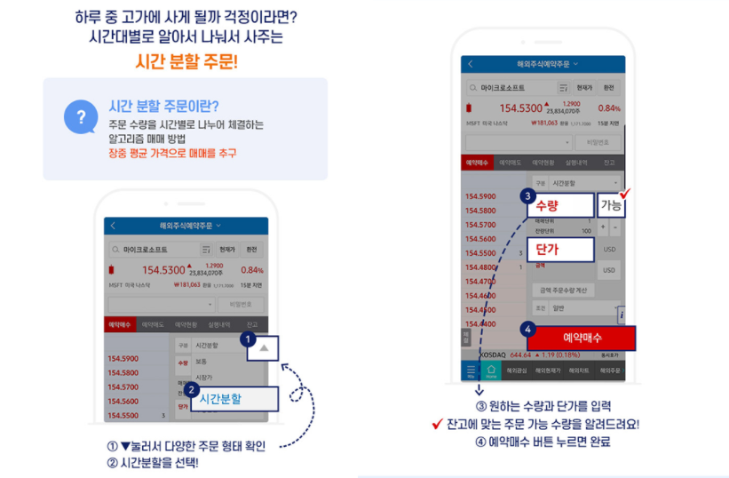 미국은 주식 거래 가능 시간이 우리나라 시간 기준으로 오후 22:30~ 오전 05:00입니다. 시각으로 새벽에 주식시장이 운영 되기 때문에 예약 매수를 활용할 수 있습니다. 원하는 단가에 예약 매수를 한다면 그 가격이 됐을 때 매수가 됩니다. 가격이 되지 않았을때는 매수가 되지 않습니다.