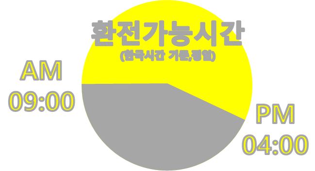 환전하기 탭에 가시면 환전 가능금액과 어느나라의 돈으로 환전할지 선택할 수 있습니다. 환전 가능 시간은 한국시간 기준으로 오전 09:00부터 오후 16:00까지입니다.