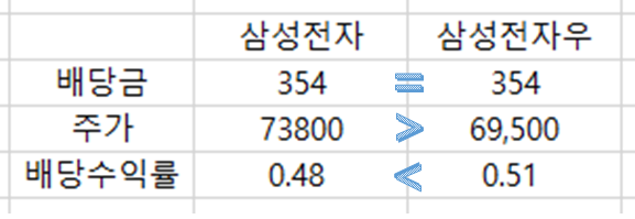 예시로 삼성전자와 삼성전자 우의 배당금은 같으나 주가가 차이가나서 배당수익률이 우가 더 높습니다. 소액 투자자 입장에서 의결권에 관심이 없으니 우선주에 더 관심이 갈 것입니다.