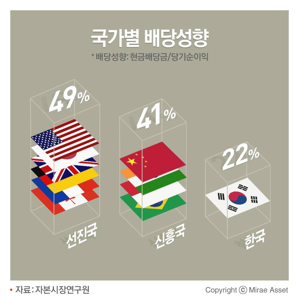 미국이 우리나라보다 배당성향 높기는 합니다. 즉 개발을 한창 하고 있는 나라보다는 이미 다 성장한 선진국들의 기업들이 배당성향이 높을 수 밖에 없습니다. 우리나라 보다는 미국의 회사들이 더 배당을 많이 해주는 것이죠.