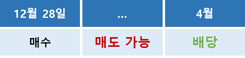 또한 (예시) 2020년 12월 28일 매수를 하고 다음 2021년 배당월인 4월까지 기다리지 않고 그 사이에 주식을 매도해도, 전년도 결산 전에 주주임을 인정받았었기 때문에 4월까지 주식을 소유하고 있지 않아도 배당을 받을 수 있습니다. 그래서 보통 12월 말에 배당주를 샀다가 1월에 팔기도 합니다. 한국 주식시장에는 이런 특성이 있습니다.