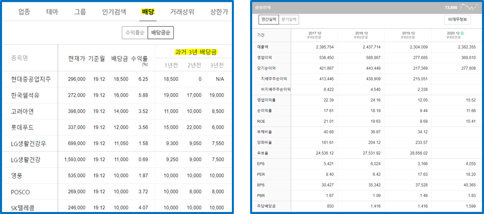네이버 증권에서 배당 탭에서 과거 3년간 배당금을 확인하거나, 기업의 재무 탭에서 배당금을 확인할 수 있습니다.