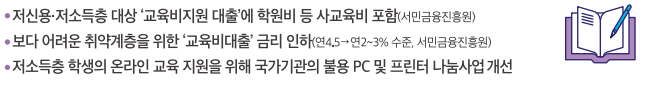 - 저신용 및 저소득층 대상 교육비지원 대출에 학원비 등 사교육비 포함(서민금융진흥원)