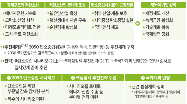 경제구조의 저탄소화, 저탄소산업 생태계 조성, 탄소중립사회로의 공정전환에 더불어 제도적 기반을 강화합니다.