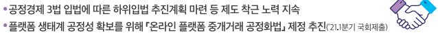 - 플랫폼 생태계 공정성 확보를 위해 '온라인 플랫폼 중개거래 공정화법' 재정 추진