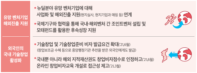 유망 벤처기업(뉴딜분야) 해외진출을 지원하고 외국인의 국내 기술창업 활성화 지원