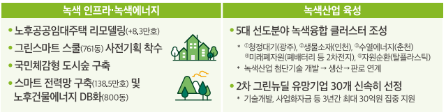 노후공공임대주택을 리모델링, 국민체감형 도시숲 구축 하고 녹색산업을 육성합니다.