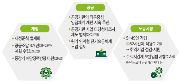 재정에서는 중장기 배당정책방향을 마련하고, 공공에서는 원가 연계형 전기요금 체계 도입을 검토합니다. 노동시장에서는 주 52시간제 보완입법을 시행합니다.