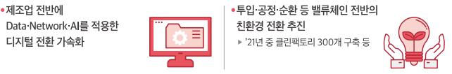 제조업 전반에 데이터, 네트워크, AI를 적용한 디지털 전환 가속화, 벨류체인 전반의 친환경 전환 추진