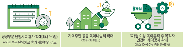 공공부문 남임치료 휴가 확대하고, 민간부문 남임치료 휴가 개선방안 검토합니다. 지역 주민 공동 육아나눔터를 확대하고 6개월 이상 육아휴직 후 복직자 인건비 세액 공제를 확대합니다.(중소 10에서 30%, 중견 5에서 15%)