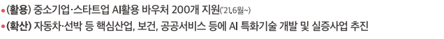- 자동차 및 선박 등 핵심산업, 보건, 공공서비스 등에 AI 특화기술 개발 및 실증사업 추진