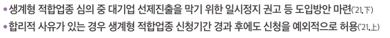 - 생계셩 적합업종 심의 중 대기업 선제진출을 막기 위한 일시정지 권고 등 도입방안 마련