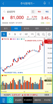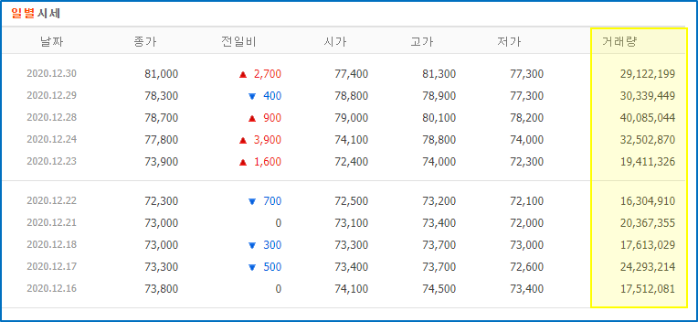 거래량은 종목별 단가가 상이하기 때문에 간혹 거래대금으로 보는 경우도 있습니다. 사실 한 종목 내에서는 큰 의미는 없지만 거래대금은 '거래량 x 주가'로 계산되기 때문에 어떤 종목이 더 시장의 관심이 많은가 판단하는데 기준이 될 수 있습니다.
