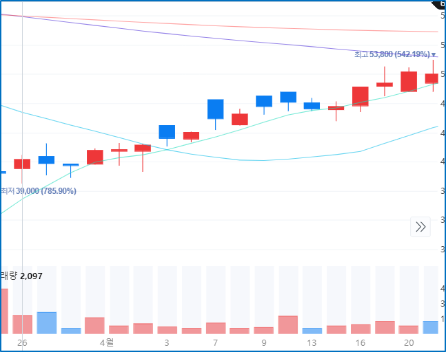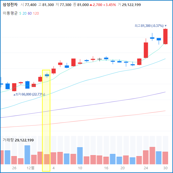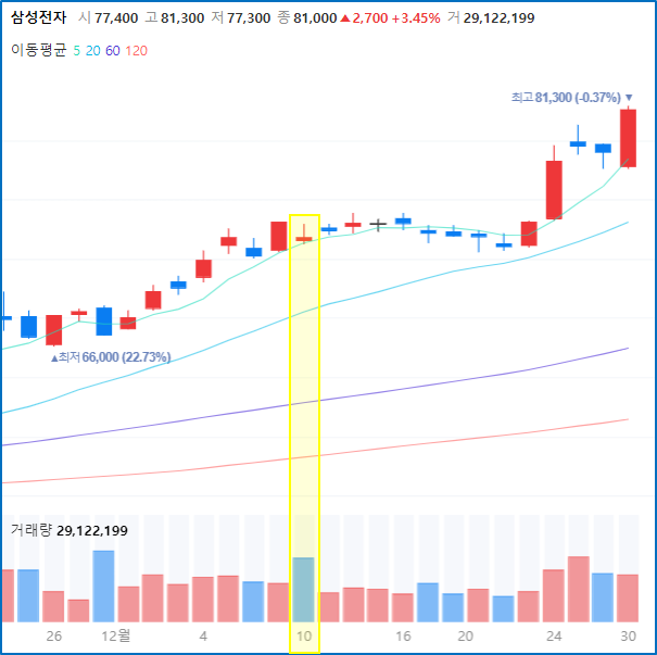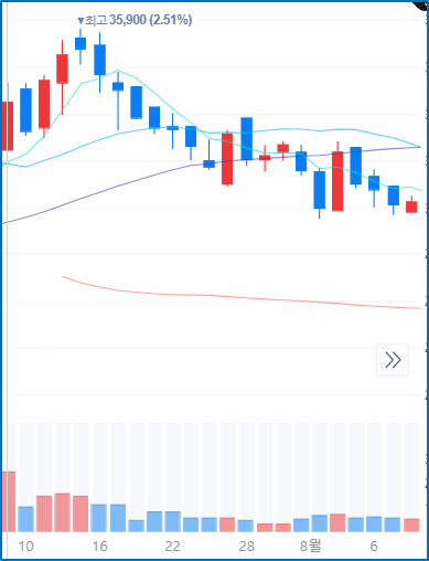 - 주가가 양봉의 붉은색, 거래량 음봉의 파란색 가능
