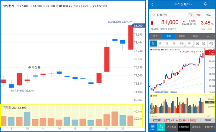 거래량은 종목에 대한 관심과 투자자의 심리를 보여주는 중요한 지표입니다. 그렇기 때문에 주식 캔들차트(봉차트) 밑에 대부분 거래량 지표를 표기합니다.