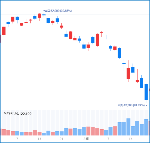 주식 거래량 색깔이 파란색으로 변하면, 거래량이 전일 대비 감소한 경우입니다.