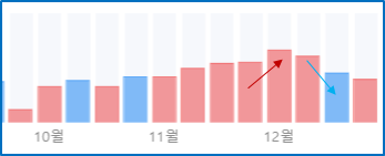 - 주가가 양봉의 붉은색, 거래량 음봉의 파란색 가능