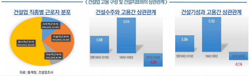 - 건설물량 증가와 고용 간 상관관계는 최근 매우 낮아지는 추세, 산업연관표상 고용유발효과 역시 하락