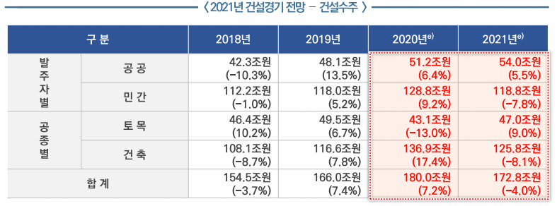 - 건설수주 : 기저효과(19∼20년 7%대 증가)에 따라 4% 감소할 것으로 예상