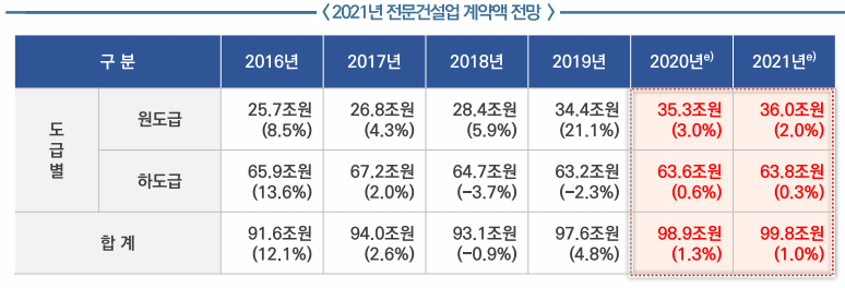 - 2021년 전문건설업 계약액은 2020년 대비 1% 증가한 약 100조원 전망