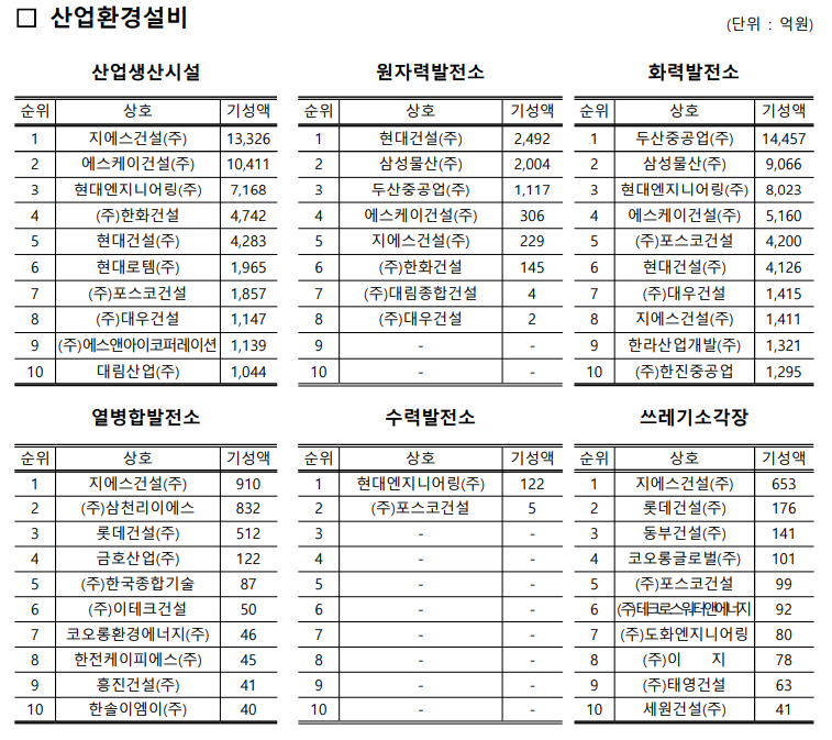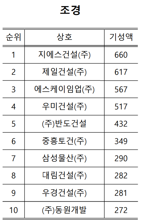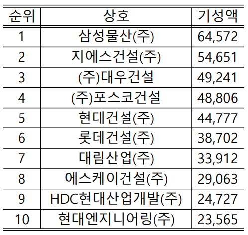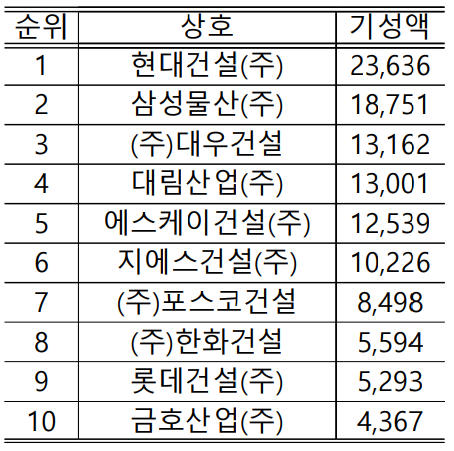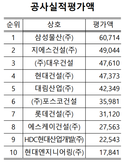 1위는 삼성물산이 약 21조로 7년 연속 1위를 차지했으며 2위와 3위는 현대건설(약12조) 대림산업(약 11조)입니다. 그 뒤는 4위의 GS건설(약 10조), 5위의 포스코건설(약8조), 6위는 대우건설(약 8조)이 기록했습니다.