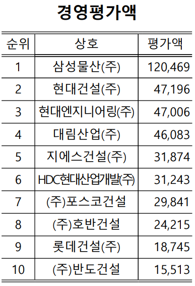 경영평가액 순위는 1위 삼성물산, 2위 현대건설, 3위는 현대엔지니어링이 기록했습니다.