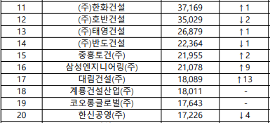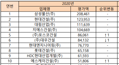 7위 현대엔지니어링(약 8조), 8위 롯데건설(약 7조), 및 9위 HDC현대산업개발(약 6조)은 전년도와 동일한 순위를 유지했으며, 지난해 11위를 기록했던 SK건설(약 5조) 10위를 기록했습니다.