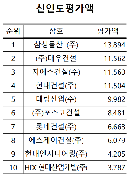 신인도평가액 순위는 1위 삼성물산, 2위 대우건설, 3위 지에스건설이 차지했습니다.