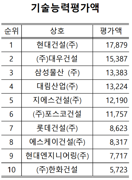 기술능력평가액 순위는 1위 현대건설, 2위 대우건설, 3위 삼성물산이 차지했습니다.