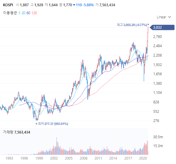 즉, 3032의 코스피 지수는 현재 코스피시장의 상장한 종목의 전체 시가총액이 1980년 1월 4일 당시 시가총액의 약 30.32배라는 뜻입니다.