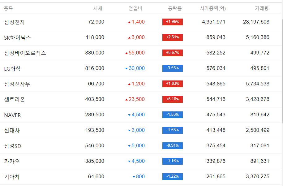 - 주요 종목에서는 삼성전자와 SK하이닉스가 약 2%의 상승을 하였고 삼성바이오로직스와 셀트리온은 약 6% 올랐습니다. LG화학, 네이버, 카카오, 현대차 등은 -3~-1%로 하락하였습니다.