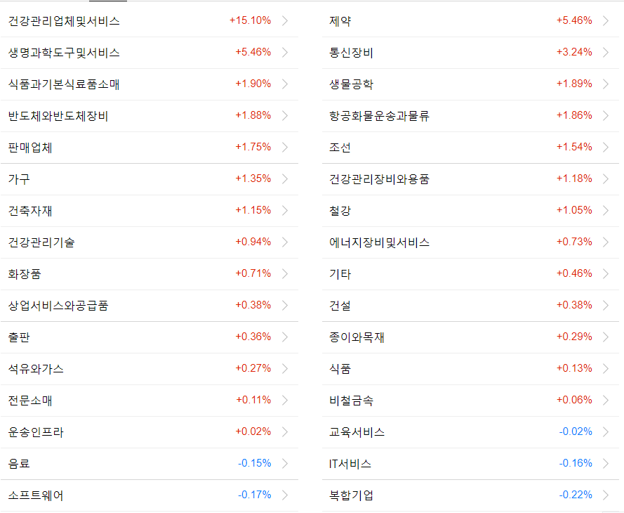 - 업종별로 상승률을 살펴보면 의약품 업종이 5.1%로 가장 크게 올랐으며 전기/전자, 비금속 광물 업종이 그 뒤를 이었습니다. 반면 증권과 기계 업종은 약세를 보였습니다.