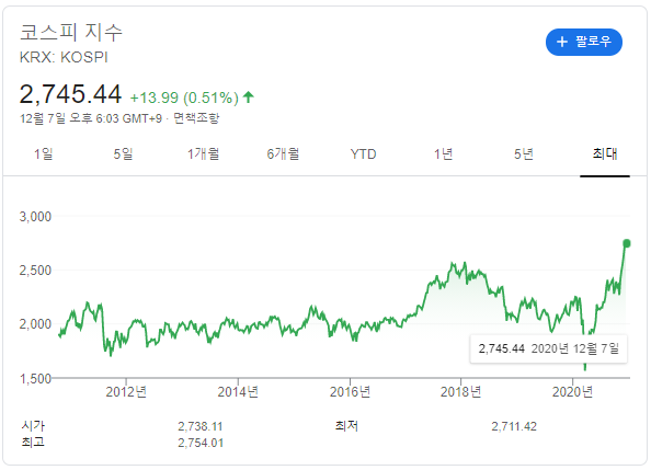 최근 코스피 지수가 연일 최고가 행진을 이어가고 있습니다. 20년 12월 07일 2750 선을 넘기도 했습니다.