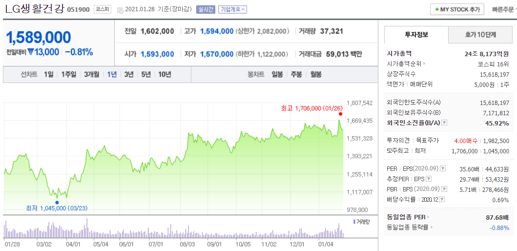LG생활건강의 주가는 2021년 1월 26일 종가기준 1,626,000원을 기록한 이후로 3일간 하락하여 1,589,000(21.01.28 기준)을 기록한 모습입니다.