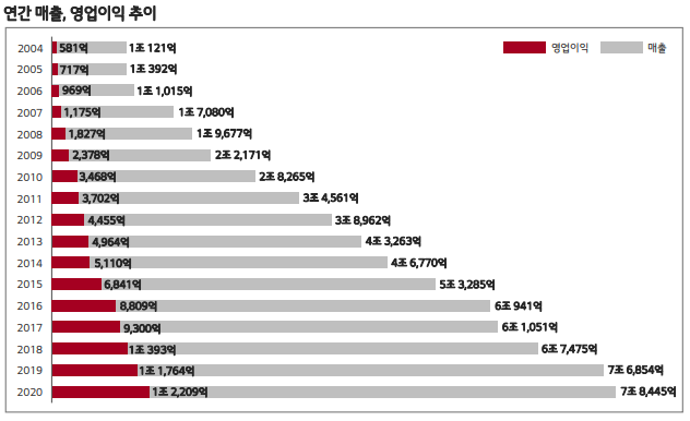 LG생활건강은 지난해 매출이 전년 동기 대비 2.1%(7조8445억) 성장했고, 영업이익 3.8%(1조2209억)증가했습니다. 당기순이익도 같은 기간 3.2%(8131억) 증가했습니다.