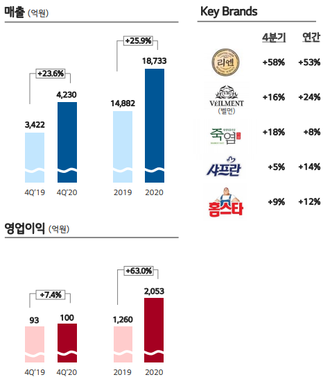4분기 매출은 전년동기 대비 3.7% 성장한 3,469억을, 영업이익은 17.1% 증가한 209억을 기록했습니다. 영업이익률은 6.0%로 0.7%p 개선되었습니다. 코로나19 영향으로 연말 외부활동이 제한되는 등 어려운 환경속에서도 주요 브랜드들의 실적으로 매출과 이익 모두 증가한 모습입니다.
