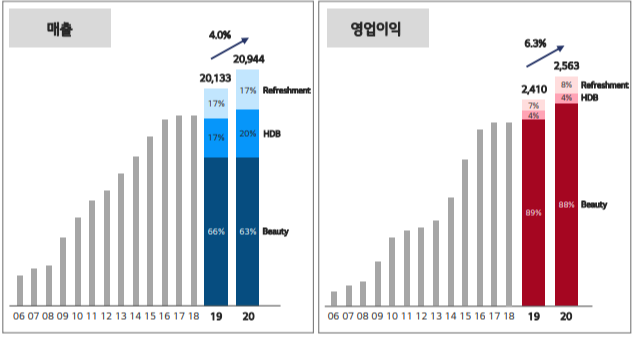 특히 지난해 화장품 소비심리가 악화되었고, 상황 속에서도 3개 사업 모두 국내 업계 1위를 기록했습니다. 뷰티 부문은 중국, 미국 등 큰 시장에서 선전하며 위험을 최소화한 모습을 보였고, HDB(Home Care & Daily Beauty) 와 Refreshment는 사상 최대 실적을 기록했습니다. 전체 화장품 매출은 5조 5,524억, 영업이익은 9,647억을 기록하였습니다.