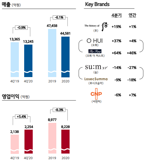 중국 화장품 매출은 전년동기 대비 4분기 41%, 연간 21% 성장하였습니다. 연간 매출은 4조 4,581억, 영업이익은 8,228억을 달성하여 전년 대비 각각 6.1%, 8.3% 감소하였습니다.