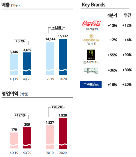 ‘코카콜라’, ‘몬스터에너지‘, ‘조지아’ 등 주요 브랜드들이 있으며, 온라인 뿐만 아니라 편의점, 식품점 채널에서 선전하며 매출 성장을 이룬 모습입니다.