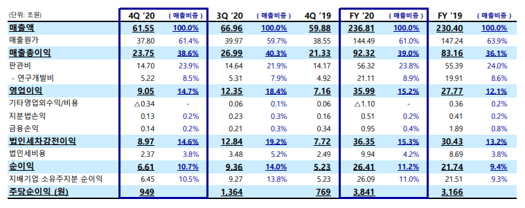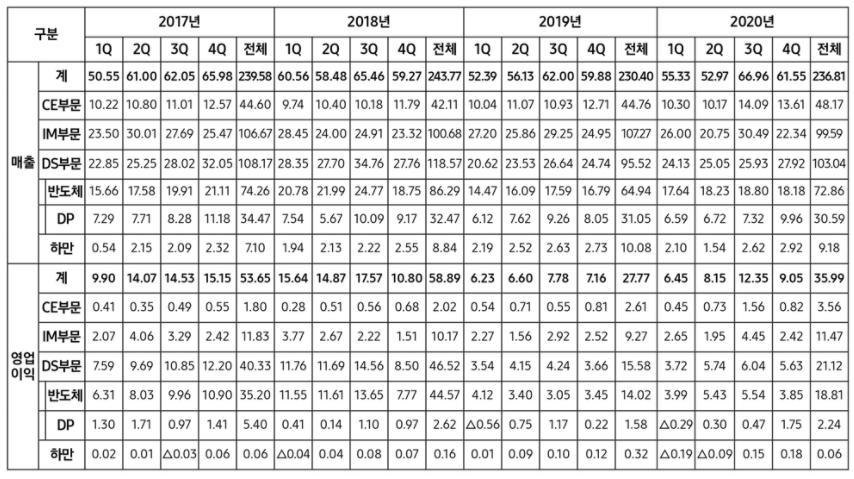삼성전자는 연결 기준으로 매출 61.55조원, 영업이익 9.05조원의 2020년 4분기 실적을 발표했습니다. 2020년 연간으로는 매출 236.81조원, 영업이익 35.99조원을 기록했습니다.