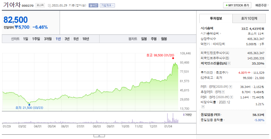 기아차는 올해 실적 개선의 영향 그리고 애플과의 전기차 협력 이야기가 나오며 주가 상승을 한 모습입니다. 7만 원대였던 주가는 9만 원대로 상승한뒤 현재는 8만원대를 유지하고 있습니다.