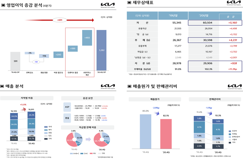 4분기 매출액은 전년 대비 5.0% 증가한 16조9106억원을 기록했습니다. 영업이익은 신차 판매 증가 영향으로 수익성이 증가했습니다. 특히 RV 차종의 판매 비중은 전년 동기 대비 6.2%포인트 상승한 58.7%로 역대 최고 수준을 기록했습니다.