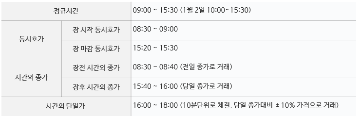 - 주식 가격 : 09:00 / 15:30분에 결정된 동시호가