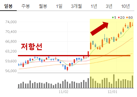 반복되는 차트를 보면 계속해서 일정 금액 수준을 넘지 못하고 터치만 하는 경우가 있습니다. 이를 선으로 표현하여 저항선이라 합니다. 흔히 쓰는 표현으로 "저항선을 넘었다" 는 생각했던 저항 선의 금액을 넘어갔을때 쓰는 표현이고, "지지선을 이탈했다" 라는 표현은 생각했던 지지선 이하로 하락했다 라고 이해하시면 됩니다.