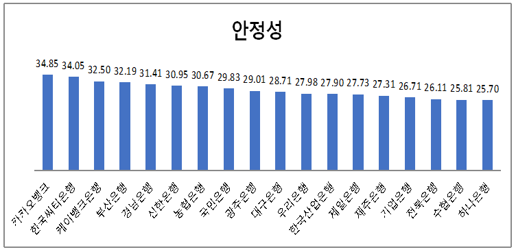 전년도 1위 한국씨티은행은 올해 안정성 2위를 기록했으며, 케이뱅크는 작년 안정성 15위에서 3위로크게 순위 상승하였습니다.