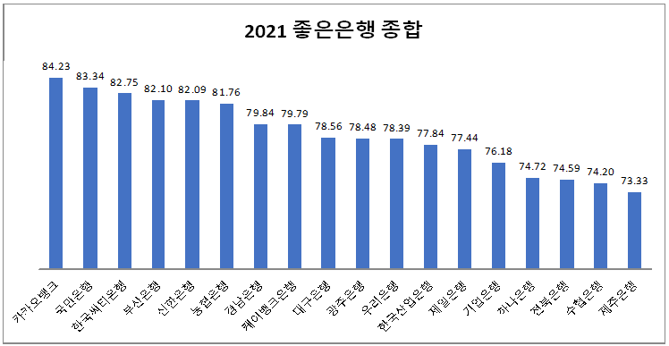 2021년 평가결과 카카오가 1위를 기록했습니다. 2위는 KB국민, 3위는 한국씨티가 기록했습니다.