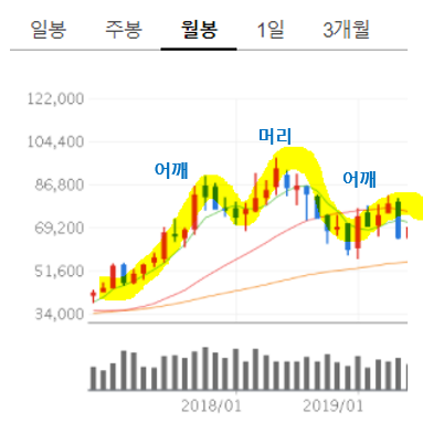 흔히 가장 많이 이야기하는 패턴이 "해드 앤 숄더" 입니다. 샴푸는 아니고 주식의 흐름이 양쪽 어깨와 머리처럼 보인다고 해서 이름이 해드 앤 숄더라는 이름의 패턴이 된 것입니다.