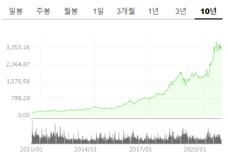 2010년대에는 변화가 많은 시기 였기 때문에 기술적 변화의 흐름에 탑승하지 못한 기업은 많은 하락을 보였습니다. 반면 아마존 같은 경우에는 100배가 넘게 형성이 되었습니다.